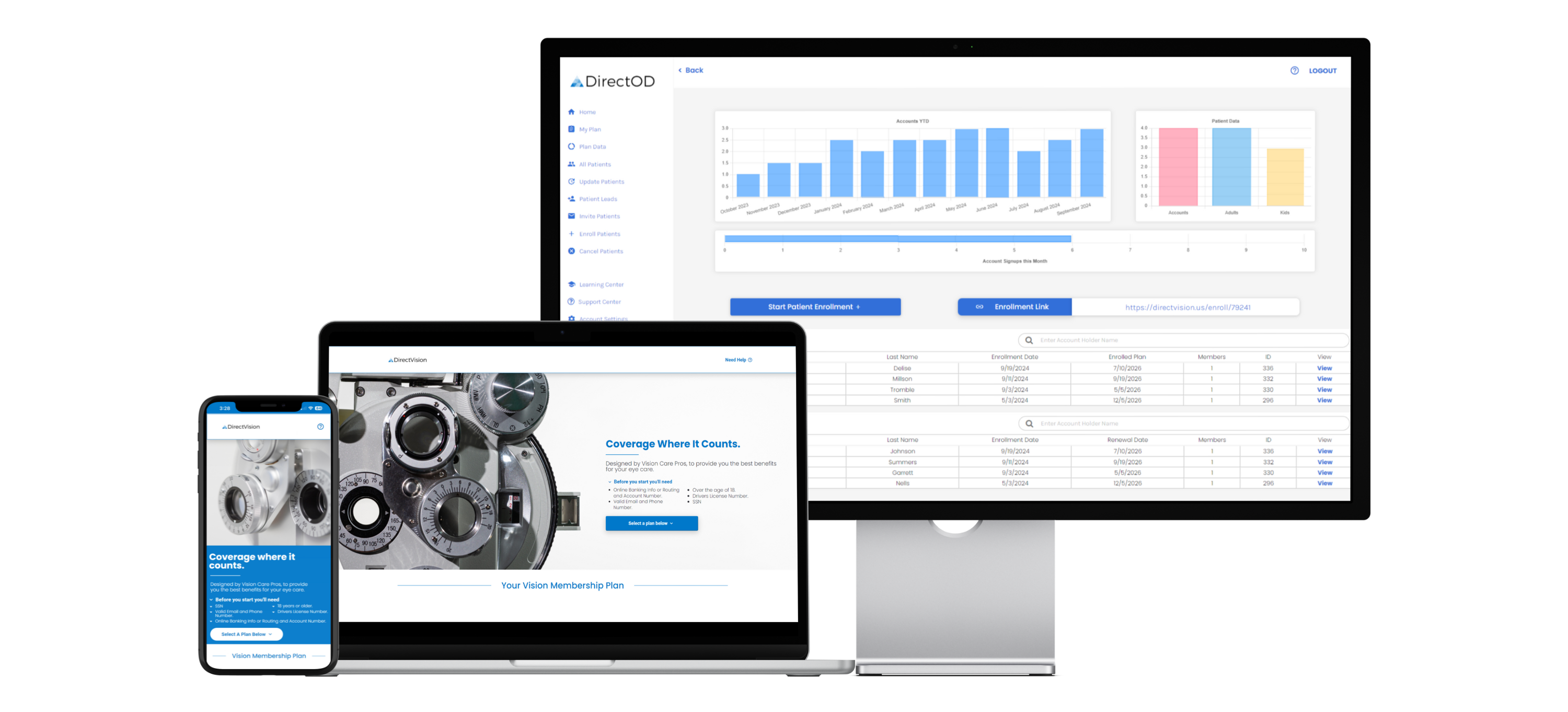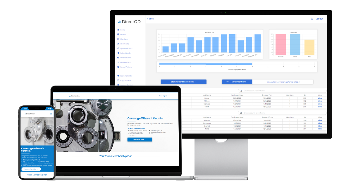 DirectOD Vision Membership Plans are NOT insurance. Members pay a monthly or annual fee directly to participating eye care providers in exchange for access to discounted services, benefits, and product savings as outlined in the provider’s custom membership plan. Members are responsible for paying their provider directly for any services or products received beyond the plan’s benefits. Plan features, pricing, and savings may vary by provider and location — please refer to your provider’s specific plan terms for full details. Vision membership plans offered through DirectOD do not qualify as insurance under the Affordable Care Act and do not satisfy minimum essential coverage requirements. DirectOD is not an insurance company, and does not pay or reimburse providers for services rendered. DirectOD exclusively supports eye care and does not operate in any other medical field or acknowledge outside industry technologies attempting to operate in the eye care industry . For questions regarding your plan, please contact your participating provider or reach out to us at admin@directod.com.